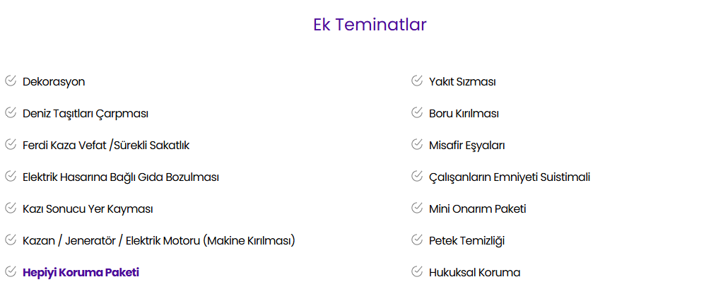 Üstelik Hepiyi Konut Sigortasının tüm teminatlarına ek olarak, dört farklı plan seçeneğinden oluşan Koruma Paketleri* mizden bütçenize ve ihtiyacınıza en uygun olanı seçerek zengin asistans hizmetlerimizden faydalanabilirsiniz.